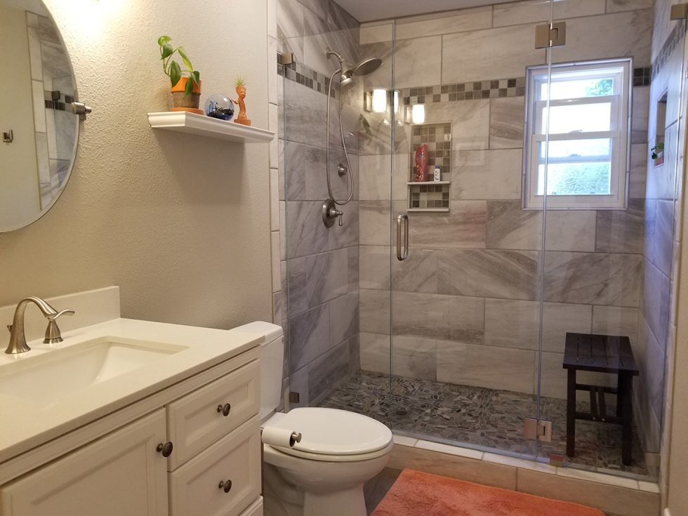 Hanshaw redesigned and remodeled the guest bathroom by expanding the shower area and relocating the water closet to accommodate a custom shower.