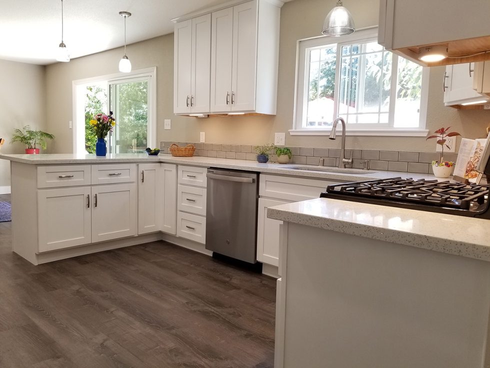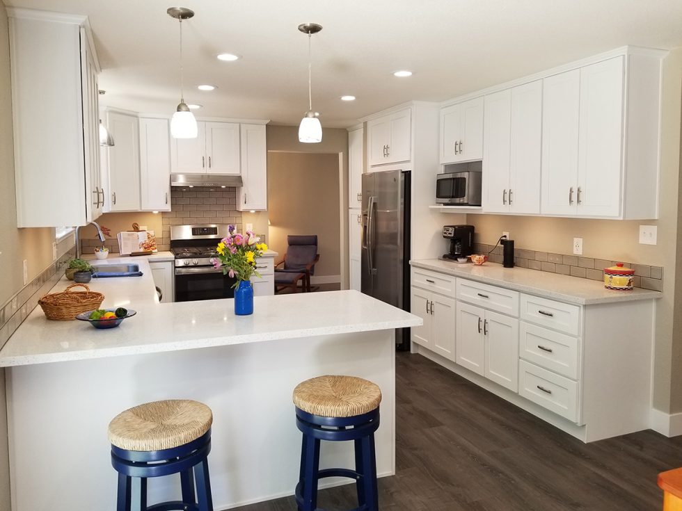 In less than 30 days, Hanshaw Construction completed a full kitchen remodel—from demolition to final touches. The outdated, cramped 1970s layout was reimagined into an open-concept space featuring a peninsula and twice the storage. The team upgraded lighting, plumbing, and electrical systems while strategically repositioning appliances to enhance the traditional kitchen work triangle.